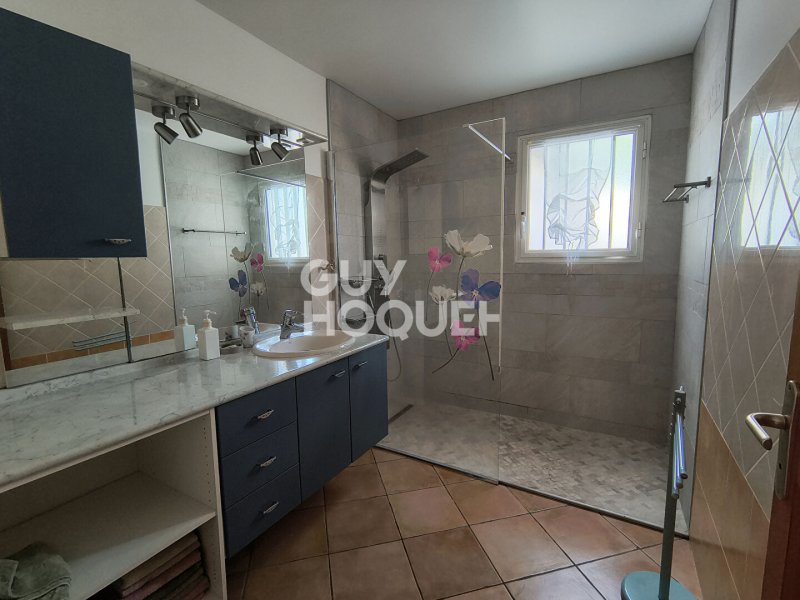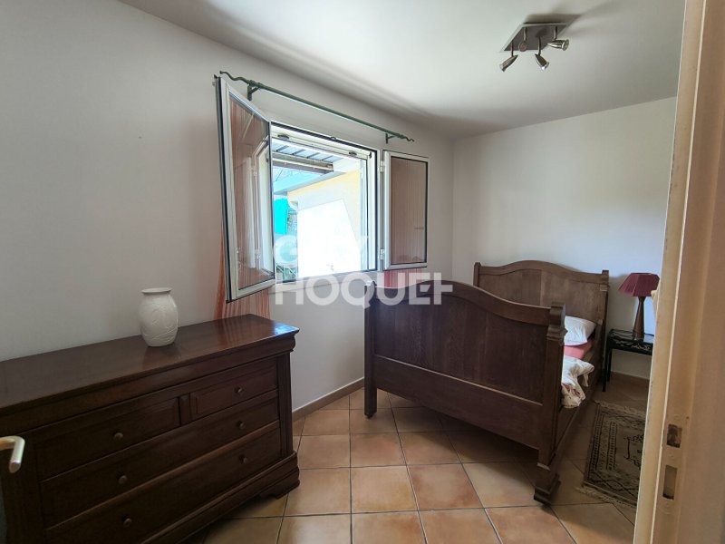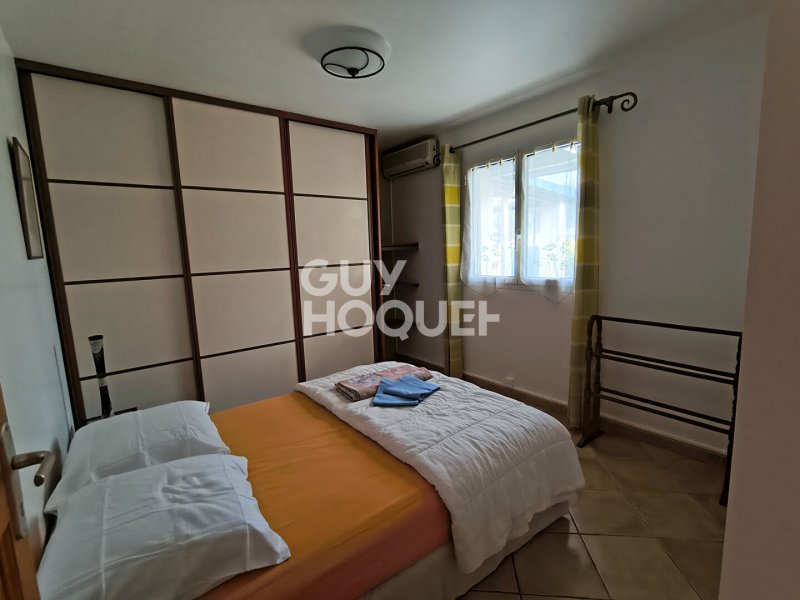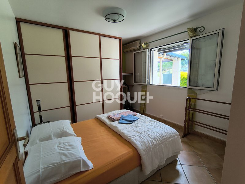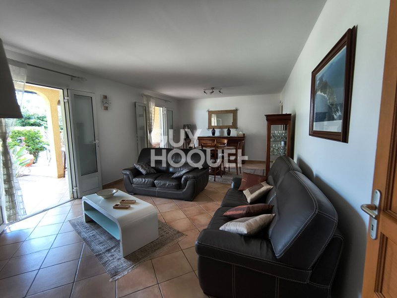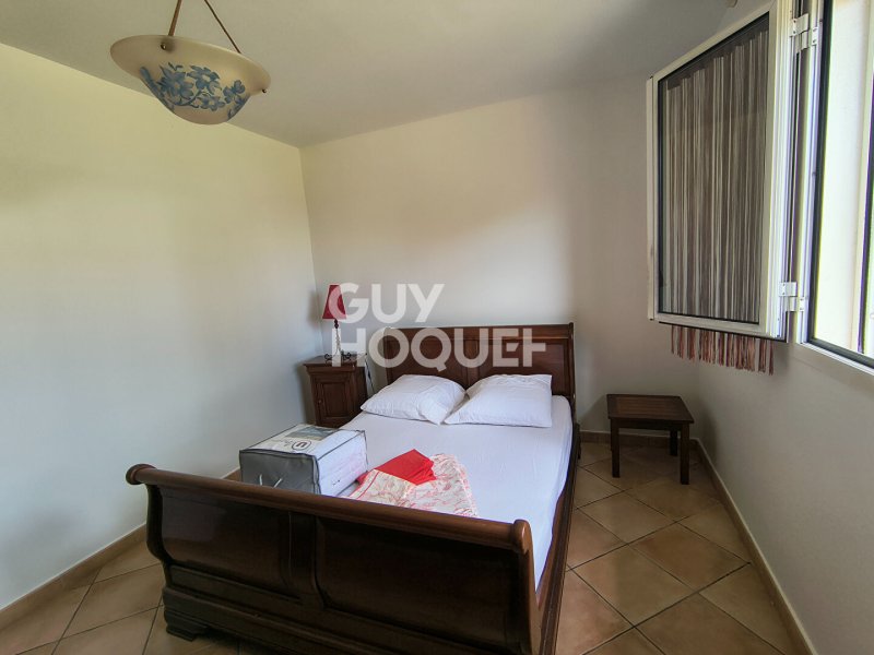 Elle se compose d'une cuisine équipée et aménagée (plaque 4 feux , frigo congélateur, hotte, lave-vaisselle, meubles bas et hauts), un salon-salle à manger climatisé donnant sur une grande terrasse, dégagement, wc, salle d'eau, 3 chambres dont 2 avec placards et une climatisée avec armoire, un garage fermé, une varangue.