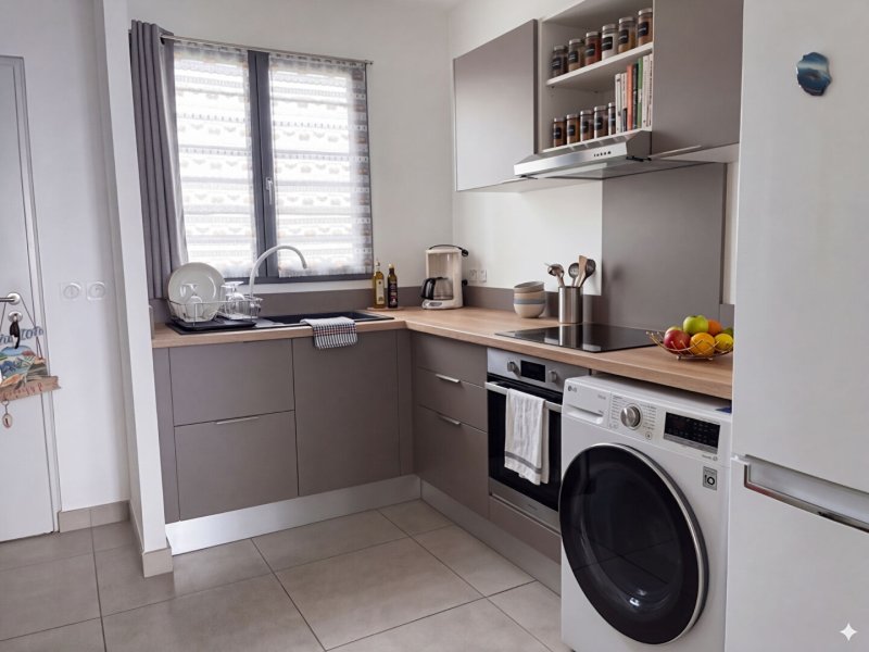 Espace jour : Un séjour lumineux avec une cuisine ouverte, complété par un placard technique pratique accueillant le chauffe-eau et l'emplacement pour la machine à laver.